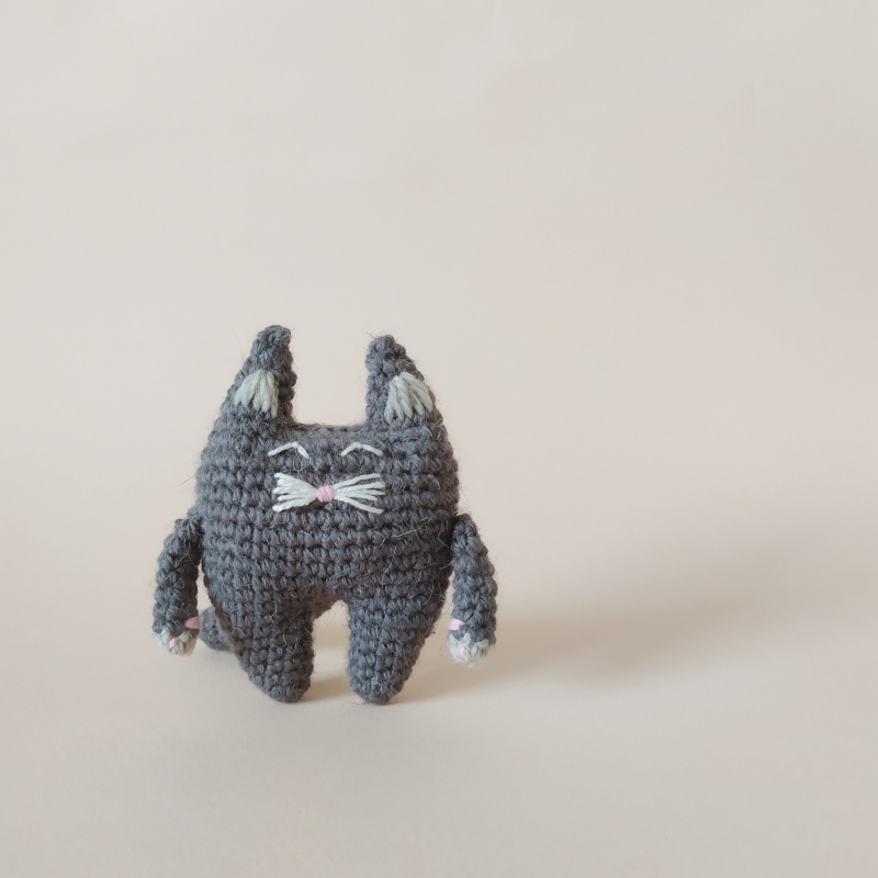 This cute and unusual cat has a unique shape – its head, body, back legs, and ears are crocheted all in one piece, while the front legs and tail are made separately and attached. The result is a charming little cat that stands proudly on its back legs and makes everyone smile!