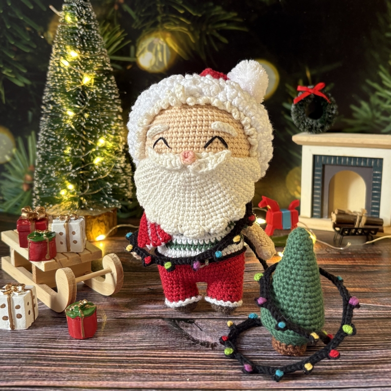 The PDF file will be available for download immediately after purchase. This pattern contains a detailed description of how to crochet Santa with his Christmas tree and light garland, with photos, as well as a list of the necessary materials and yarn.