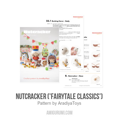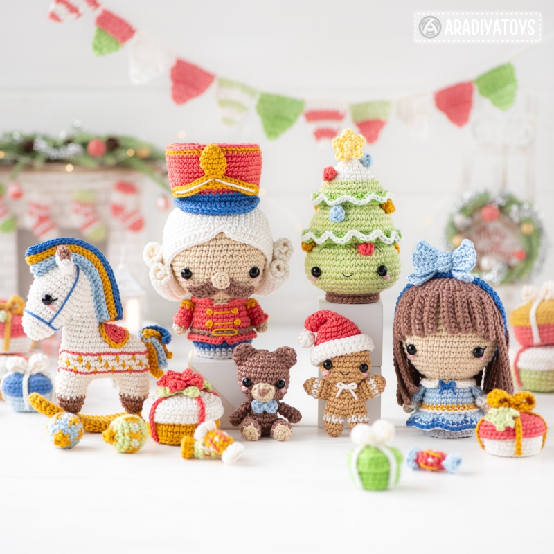 Nutcracker – the Christmas-themed set of toys from the ‘Fairytale Classics’ collection. This pattern describes how to create the following seven toys: Nutcracker, Clara, Christmas Tree, Rocking Horse, Mini Gingerbread, Mini Teddy Bear and Decorations (big gift box, small gift box, square gift box, candy and Christmas baubles).