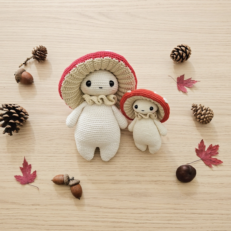 A magical mushroom creature. With different yarn, you can crochet a tiny little mushroom that can fit in your pocket, or a big soft mushie that can be cuddled on the couch. This mushroom guy is an upgraded version of an old classic, Quinn the Mushroom.