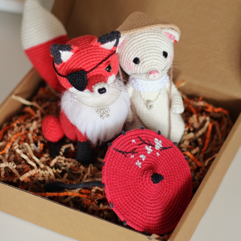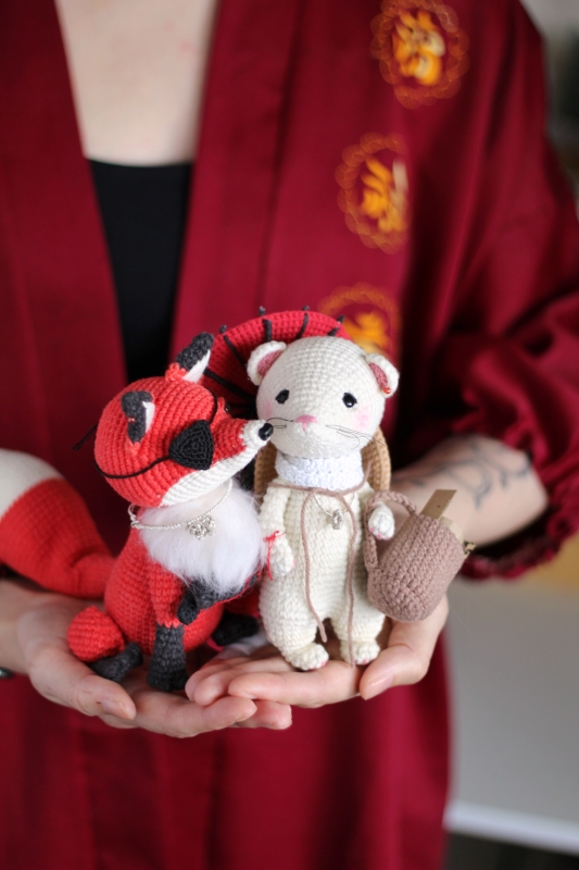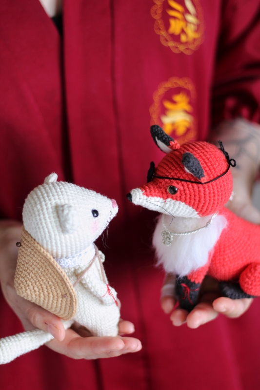 This special bundle includes two detailed amigurumi crochet patterns: Fox Hua Cheng and Weasel Xie Lian, symbolic animal dolls inspired by the beloved characters from the Chinese novel Heaven Official’s Blessing.