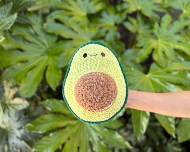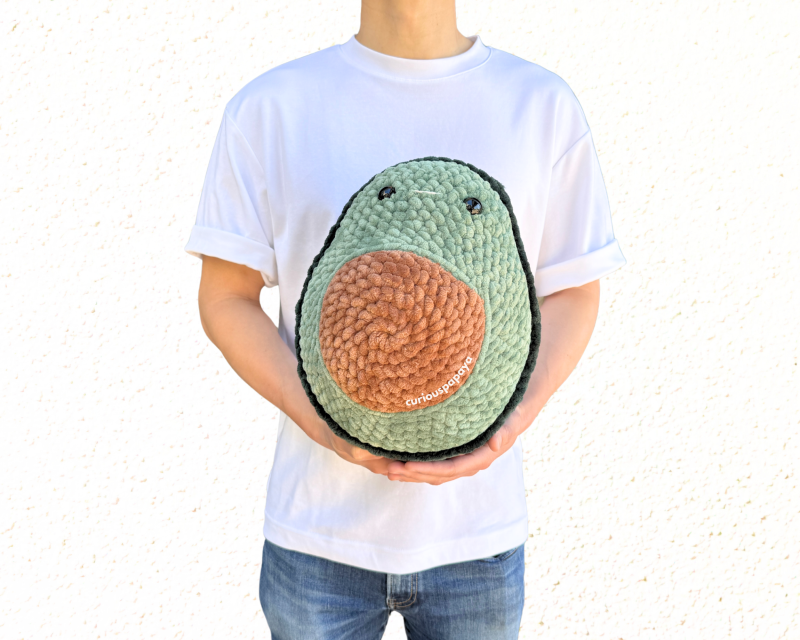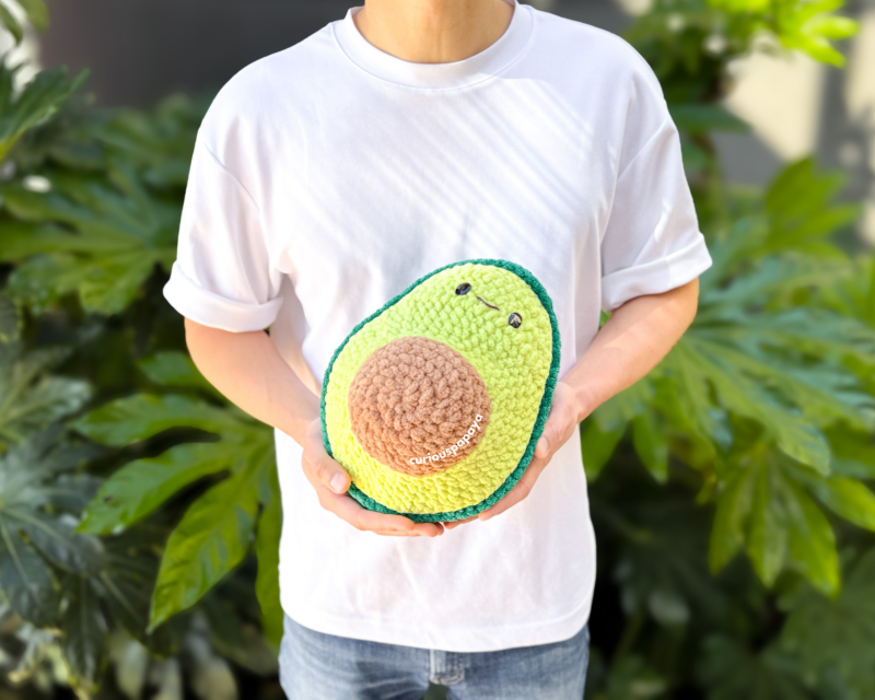 -Intro: This Giant Avocado is made with a weighted bottom, making it perfect to cuddle with. Make it even larger with #7 jumbo yarn for more fun! This pattern is also no-sew meaning that there is no sewing of pieces required - a bonus for some happy crafting!