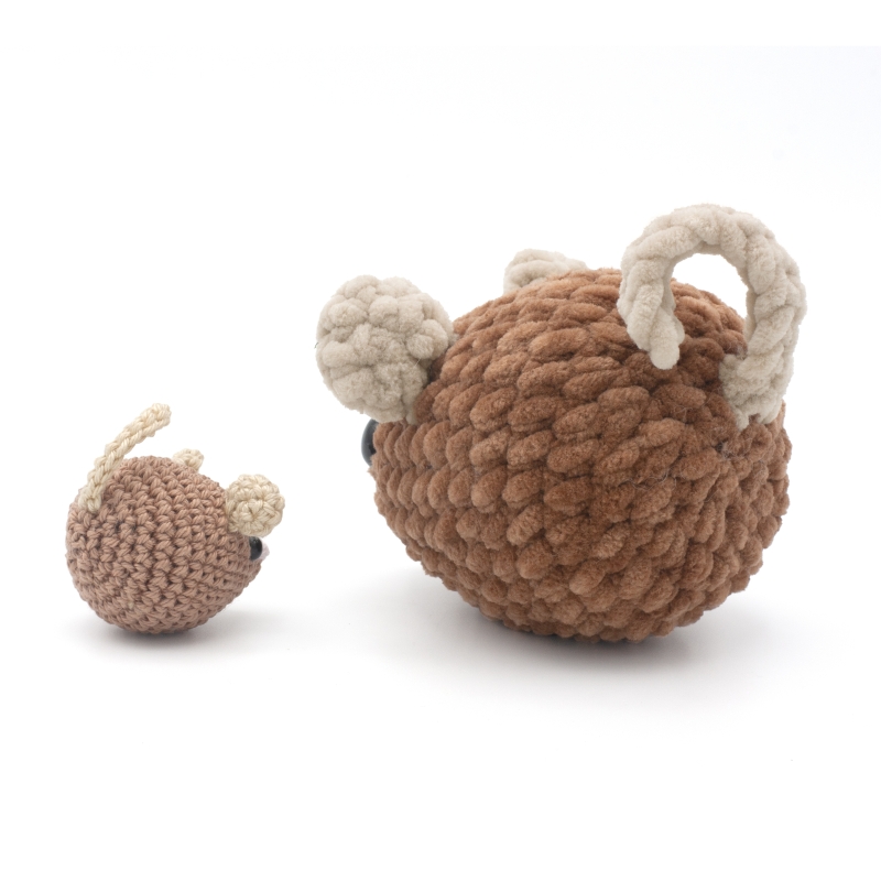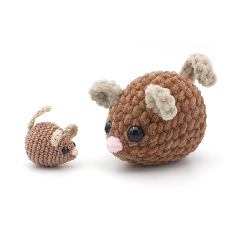 The big plush mouse (5 inch/11 cm) with super bulky chenille yarn and a H/8 5 mm crochet hook.