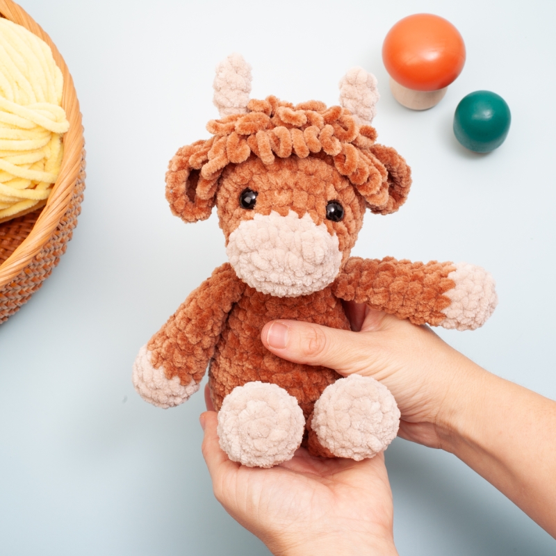 Make your own adorable and fluffy Highland Cow with this crochet pattern!