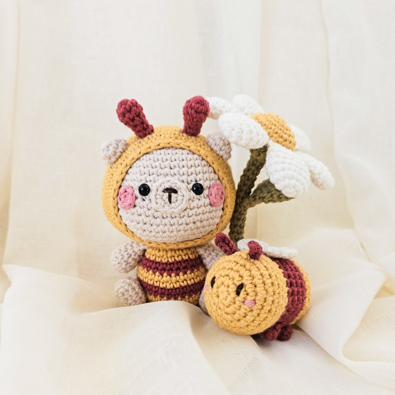 The pattern contains four parts: Honey the Bear, his honey pot, a honey bee, and flowers.