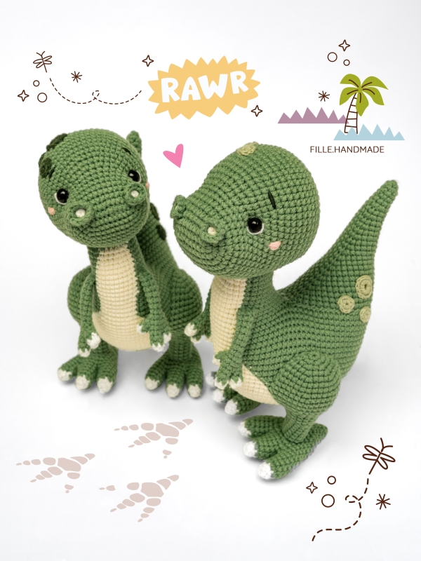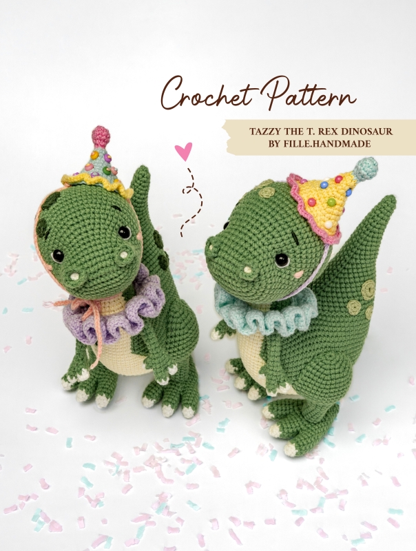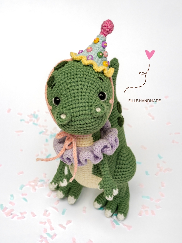 This crochet pattern PDF will guide you step-by-step to create a cute 20 cm (7,9”) dinosaur plushie with a removable party hat and collar. Perfect for beginners looking to improve their crochet skills and make a personalized plush toy!
