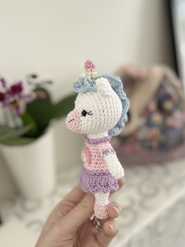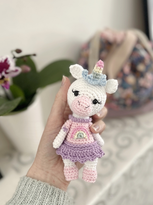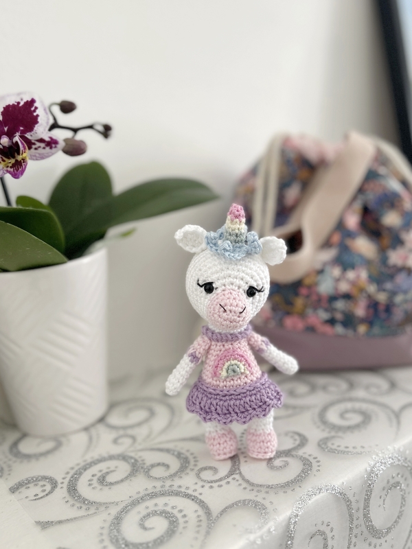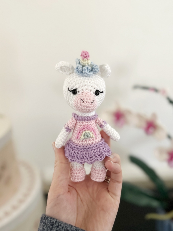 Luna is an adorable little rainbow-colored unicorn. Made with the materials indicated in this tutorial, she measures about 15 cm (including the horn), although her size may vary slightly depending on your stitch tension and the type of yarn used.