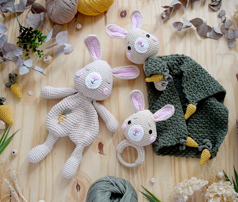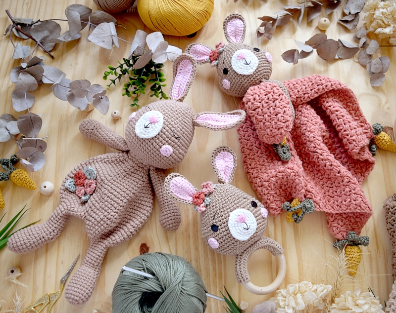 Crochet pattern set for both versions of loveys and for the amigurumi rattle – as well as accessories to decorate your piece.