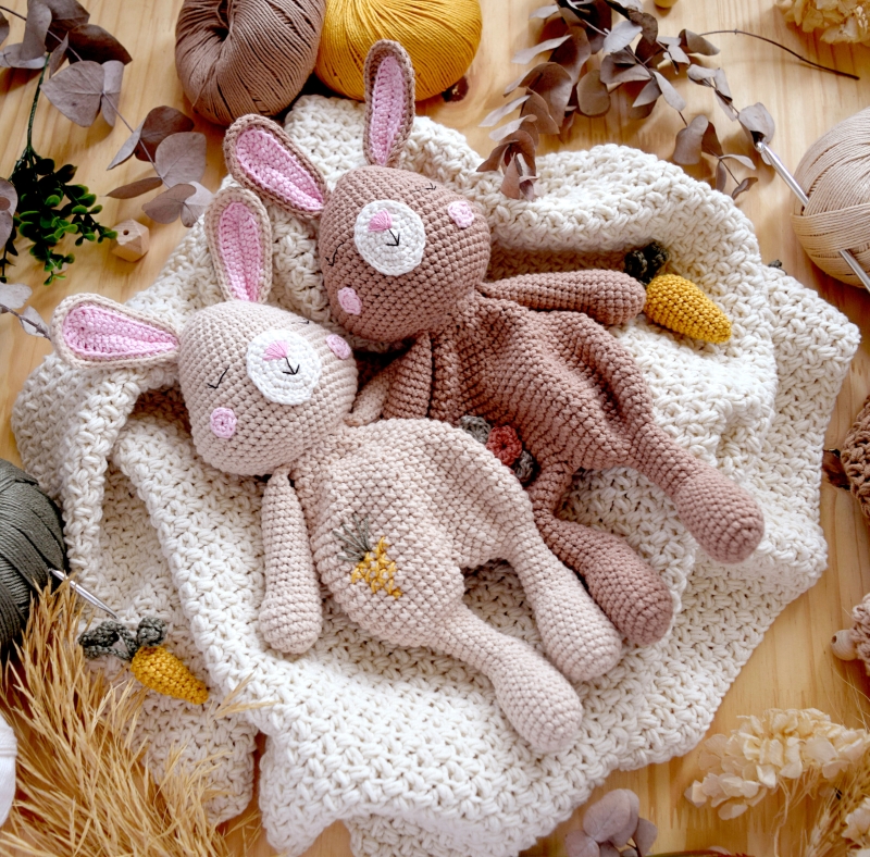 I used a blend of 55% acrylic and 45% cotton for the security blanket and bunny-shaped lovey, and 100% cotton yarn for the amigurumi, little carrots and base of the rattle.