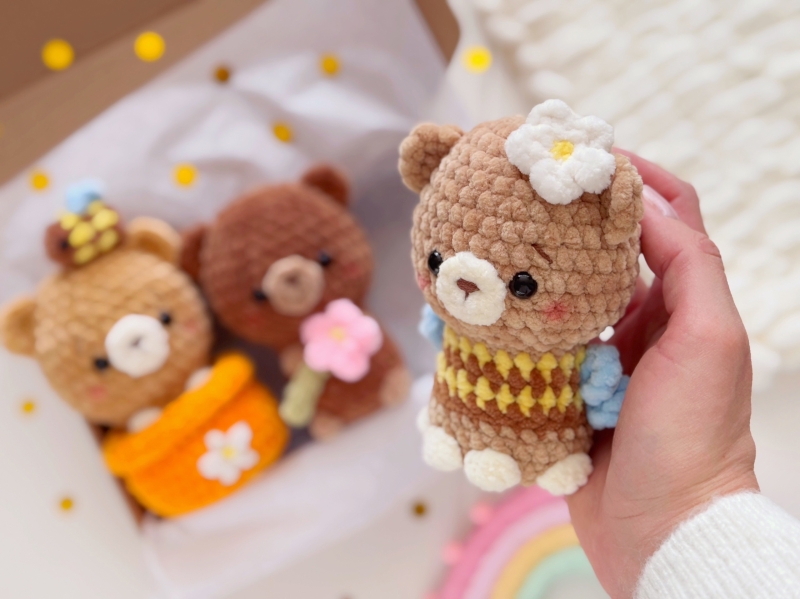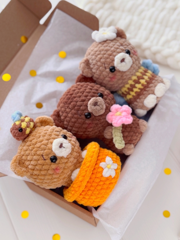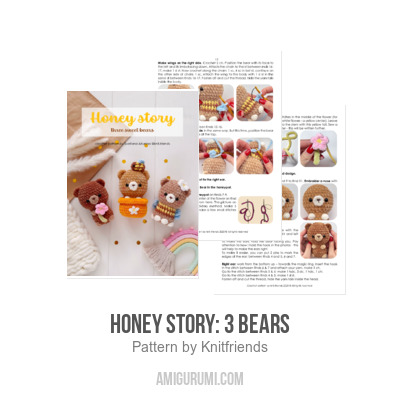 The crochet pattern is in PDF format consists of 14 pages of the detailed, step-by-step pattern how to crochet 3 bears and their accessories: bee, honeypot and flowers.