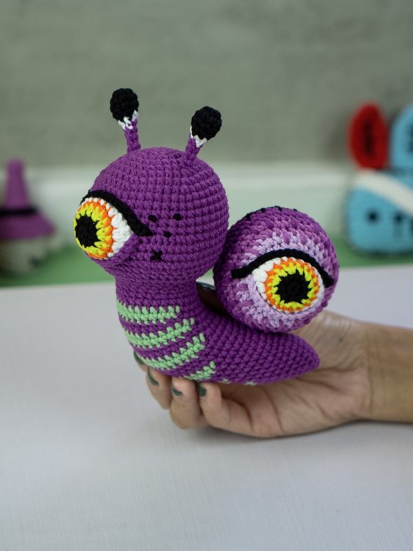 The Cyclops Snail is a whimsical amigurumi design inspired by halloween crochet themes.
