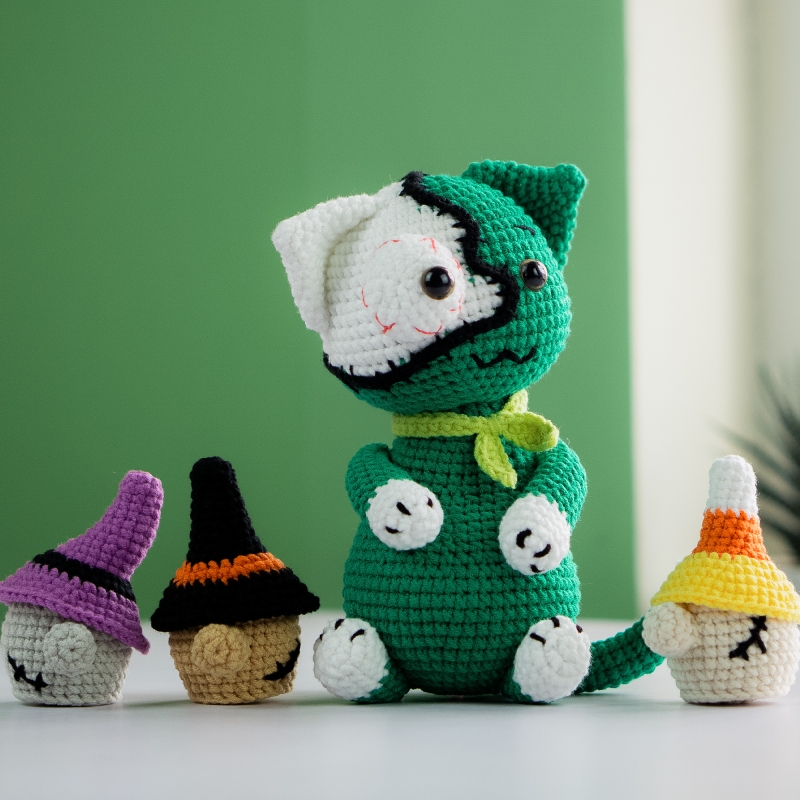 Say hello to Salem, the creepiest cutie in your yarn stash! This gothic-style amigurumi cat features a bold split-face design—half ghostly white, half zombie green—and a stitched expression full of mystery. With tiny white paws, a red-tipped tail, and a bright green scarf, Salem brings the perfect mix of spooky and stylish to your Halloween decor or creepy-cute collection.