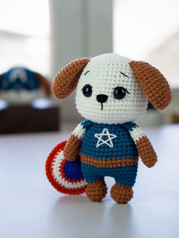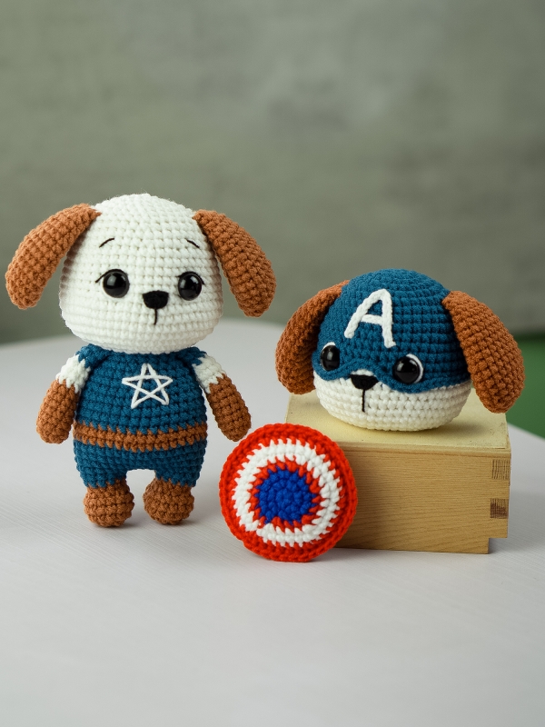 Shielddog is a small dog amigurumi with a rounded head, floppy ears, and a simple superhero-style outfit.