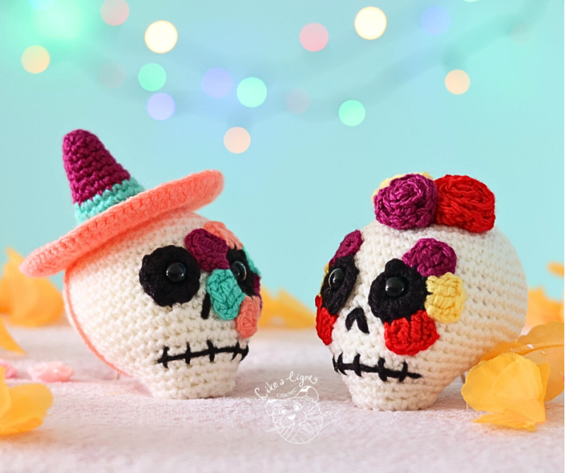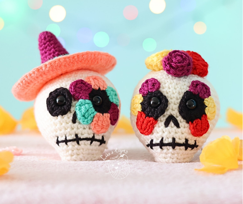 The skulls are about 8 cm (3") tall (excl. the sombrero and roses). To make them you will need:
