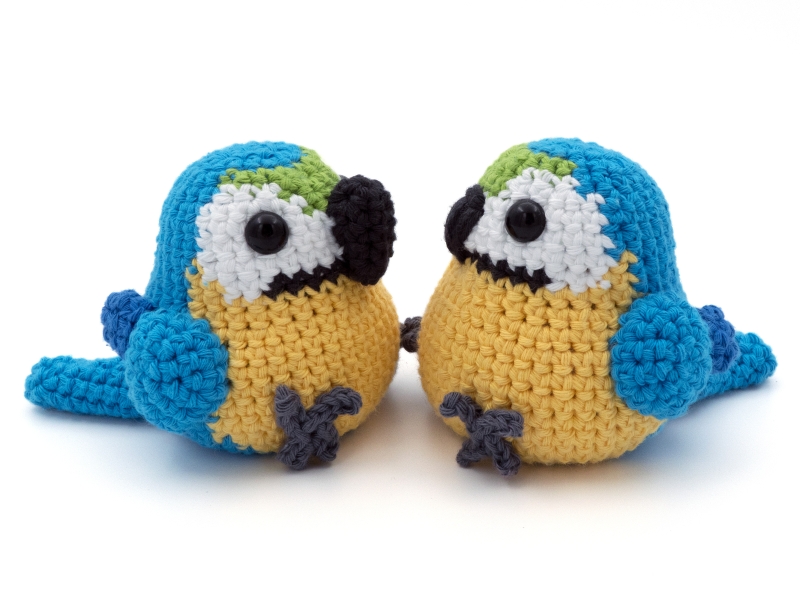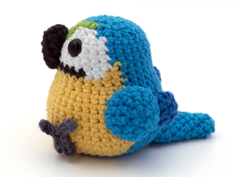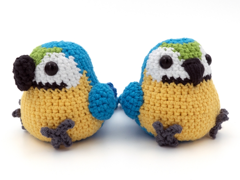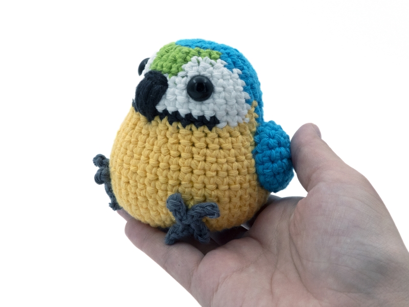 If the recommended hook and yarn size are used this blue and gold macaw parrot will be approximately 10 cm (3.9 inches) tall and 10 cm (3.9 inches) wide.