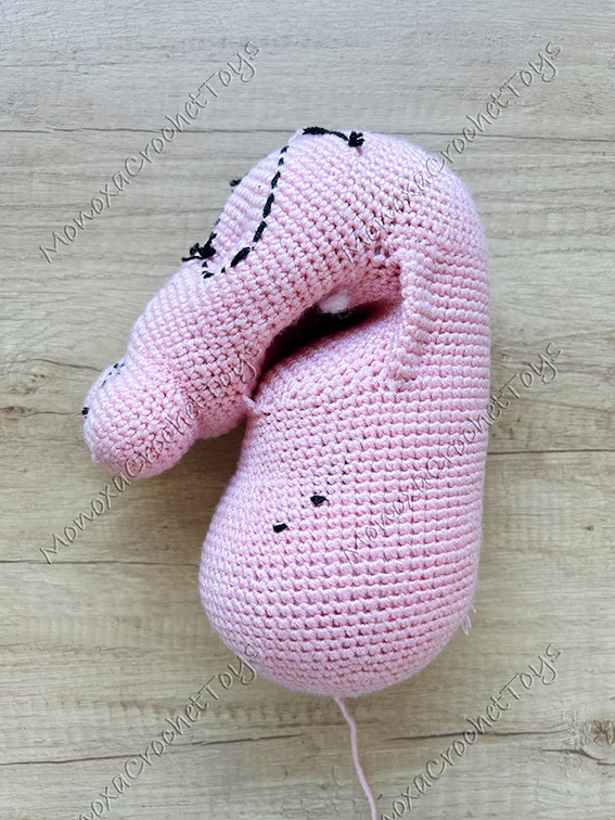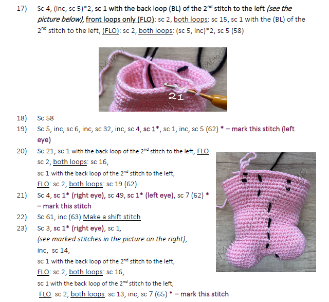 Stitches used: chain, slip stitch, magic ring, single crochet, increase, (invisible) decrease, half double crochet, double crochet, back loops only, front loops only, starting an oval piece with a foundation chain, french knot, crochet into a ring