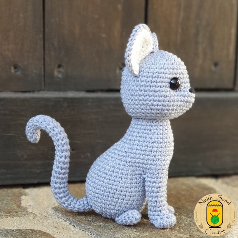 Made with a 2.5 mm hook, Fuwa the Cat measures approximately 14cm tall by 5cm wide and 7cm long (without the tail).