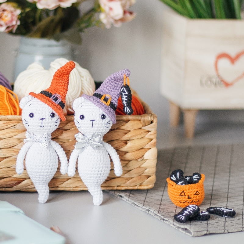 This pattern includes 12 pages and more than 50 photos of the detailed description of crocheting, assembly and decoration of the Halloween ghost cat toy with a pumpkin basket and fish skeleton.