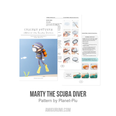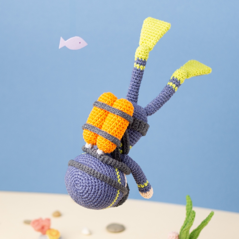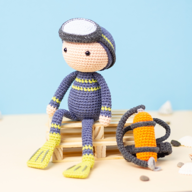 Size of the finished toy: the scuba diver size is 22 cm (8.7 inch) in height (with swim fins), if using the indicated yarn.