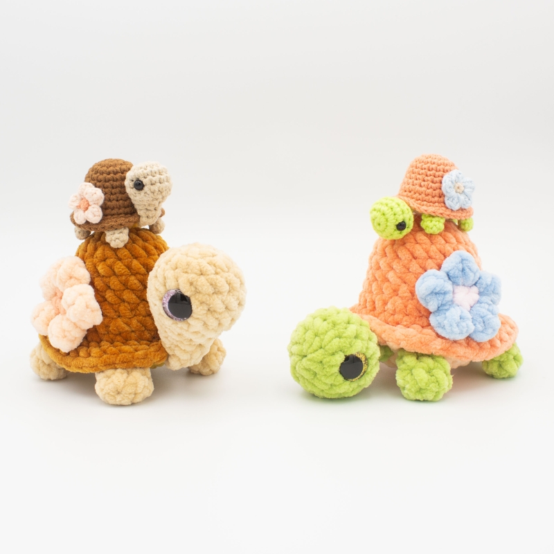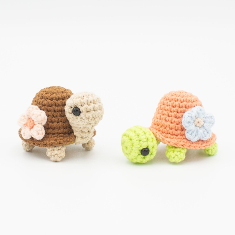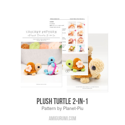Size of the finished toy: the plush turtle is 12x8 cm (4.7x3.1 inch) in length/height, the cotton turtle is 6x4 cm (2.4x1.6 inch) in length/height, if using the indicated yarn.