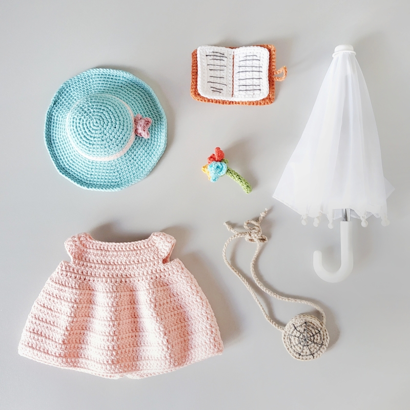 yarn: Sport weight yarn 4ply in brown and black colors for the spider’s body, and different colors for the rest of the details. Used yarn: YarnArt Jeans 160m/50g, Alize Cotton Gold 330m/100g; 1.5 mm crochet hook; 9 mm buttons, 6 pieces - 5 for the dress, and 1 for the book; tapestry needle; embroidery needle; thin black, white, orange and pink embroidery threads; pins; stitch markers; scissors; toy stuffing.