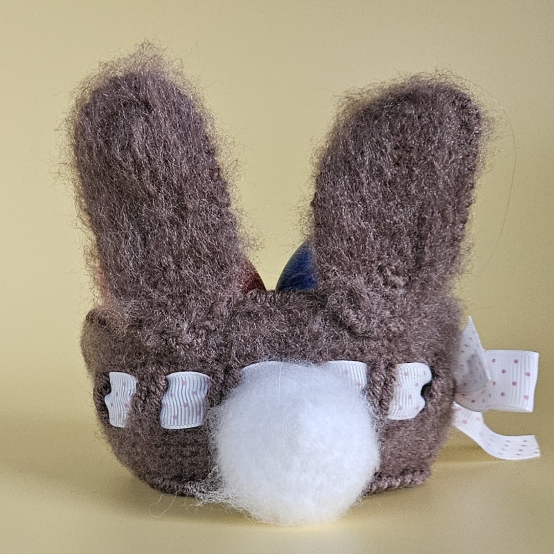 The basket is approx. 11 cm wide and 12 cm high, crocheted from Schachenmayr Bravo and brushed with an animal hair brush to achieve its soft, fluffy look. The upright ears and little paws give it a particularly playful charm. A bow on the side adds an extra cute touch to the basket.