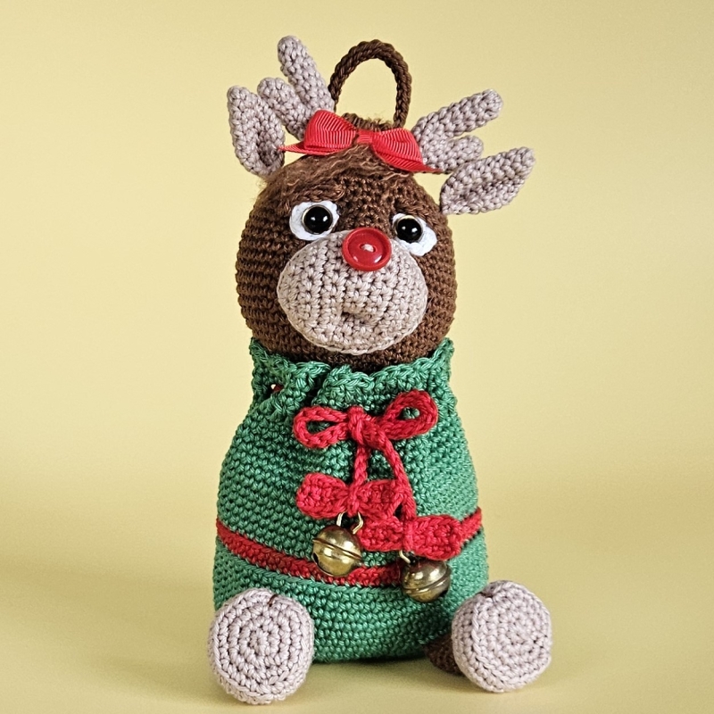 The reindeer, decorated with a red bow and a funny button nose, has a slightly squinty look, giving it a cheeky expression.