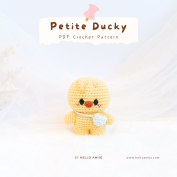 Webster is a crochet amigurumi duck, wearing the cutest bathing suit and a beachball.