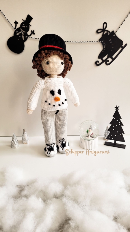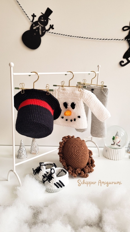 This delightful winter outfit might look a bit chilly, but it's incredibly warm. The snow-white sweater featuring Frosty the Snowman’s face pairs perfectly with the light gray pants. Robin also loves wearing sneakers, so she found a nice matching pair. To complete the outfit, a tall black hat is, of course, a must.