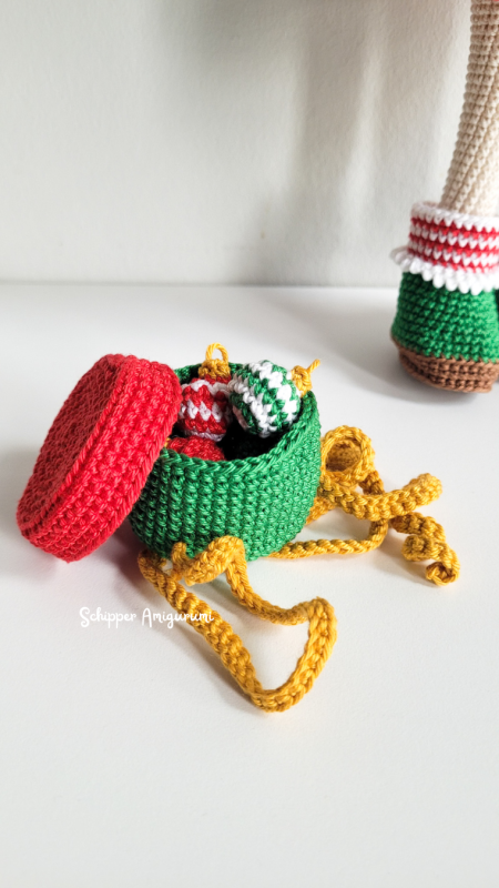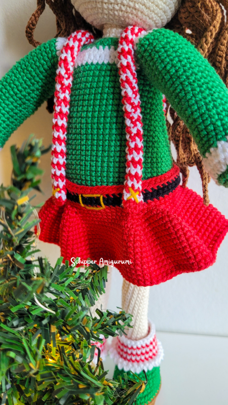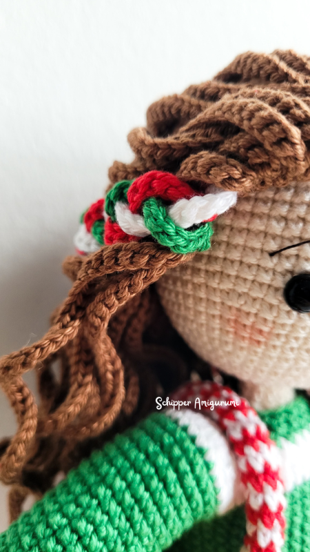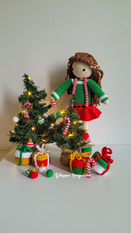 Robin is glowing in her cheerful red skirt with playful straps that remind you of candy canes. Her cozy green sweater adds a warm winter touch, while her long brown hair is beautifully decorated with a braided wreath in green, white, and red, tied together with a sparkling golden bow. And don’t miss the details: adorable green boots with red-and-white socks and… a present that actually opens! Inside you’ll find tiny Christmas baubles – a magical detail that makes this pattern extra special. Outfit Holly is the perfect way to dress up your Robin in full holiday spirit. A joyful and creative crochet experience that’s sure to bring a smile!