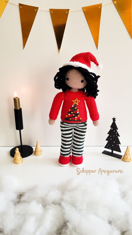 It’s almost Christmas, and Robin is excited to start decorating her house. She puts on her wonderfully soft Christmas sweater with an embroidered Christmas tree and striped sweatpants. So comfy! She lets her long, curly hair down. Still, something is missing. As soon as she retrieves her Christmas decorations from the attic, she suddenly finds the missing item! Her Christmas hat with a beautiful fur trim. All that searching in the attic left her with cold feet. Luckily, she has matching red slippers.