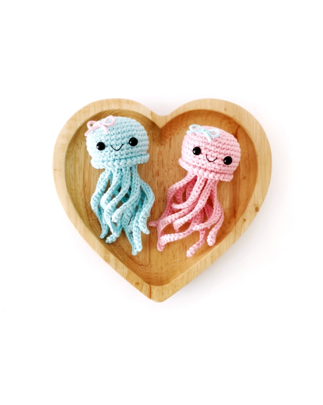 This quick and easy amigurumi jellyfish has all of the cuteness and none of the sewing. It's a fun project for using up leftover yarn and is the perfect size for keychains and bag charms making it a great addition to your next market/craft fair or a quick gift.