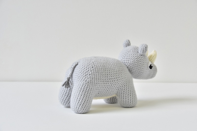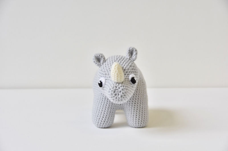 When made with the described yarn and hook size, the rhino will become about 20cm/8" in height and 28cm/11" in width.