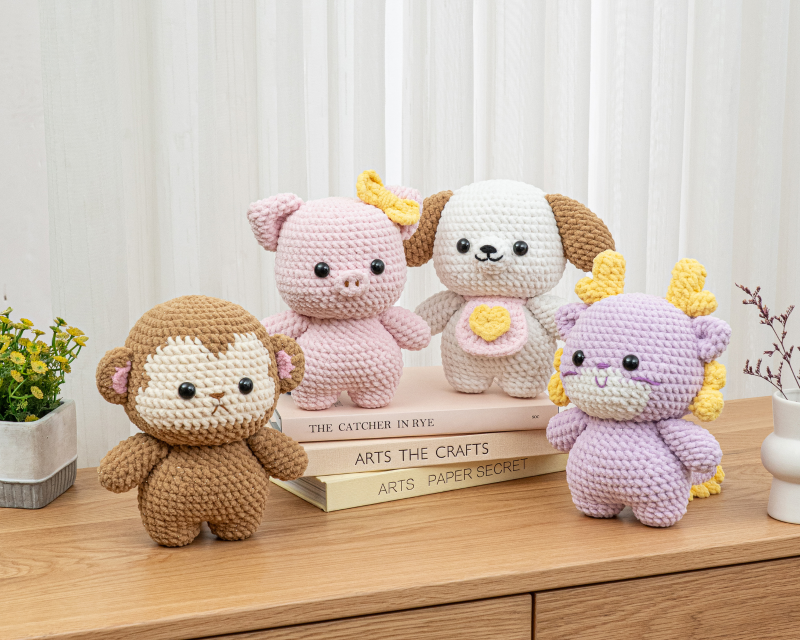Snag this 4-in-1 Crochet Pattern Bundle and create your own adorable crew! This set includes Baby Monkey, Pinky Piggy, Happy Puppy, and Dreamy Dragon. They are beginner-friendly with easy-to-follow pattern and numerous pictures.