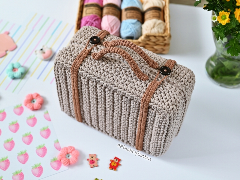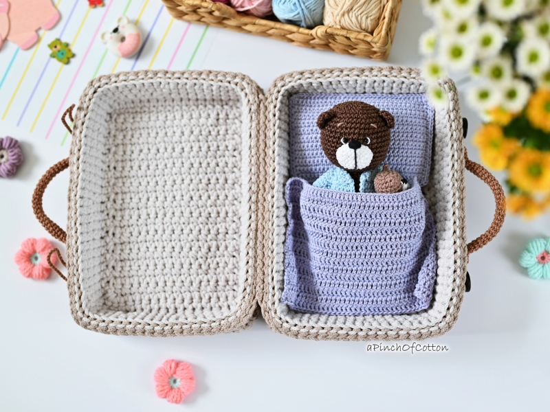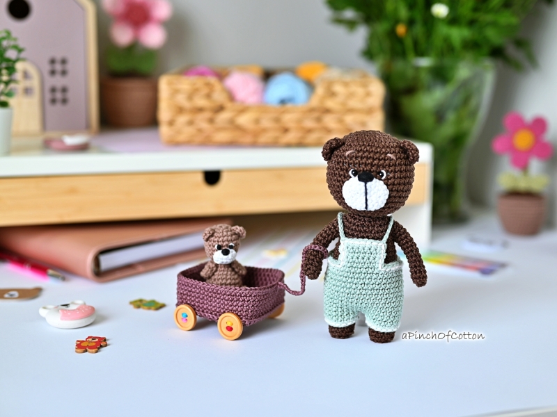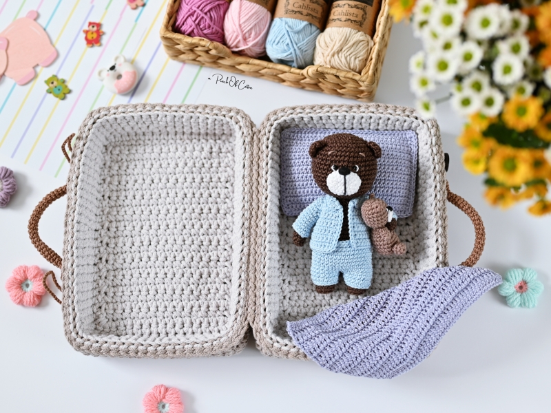 This crochet pattern includes 54 pages of detailed, easy-to-follow instructions for creating a crochet bear with all his accessories: suitcase, pillow, blanket, outfit (pajamas and dungarees), little bear and his cart. The PDF features clear written directions accompanied by numerous step-by-step photos, helpful notes, and tips throughout to guide you every step of the way.