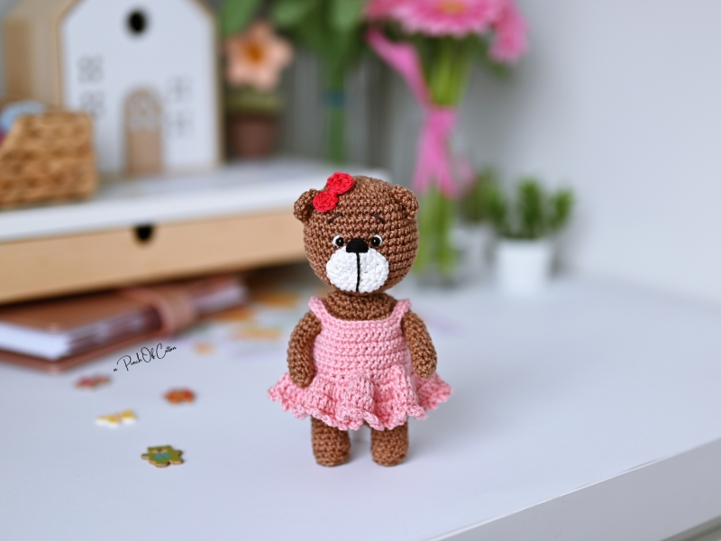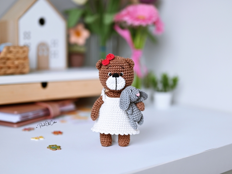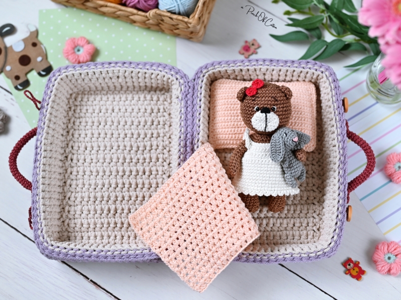 This crochet pattern includes 50 pages of detailed, easy-to-follow instructions for creating a little lady bear with all the accessories: suitcase, pillow, blanket, outfit (dress and nightgown) and little bunny. The PDF features clear written directions accompanied by numerous step-by-step photos, helpful notes, and tips throughout to guide you every step of the way.