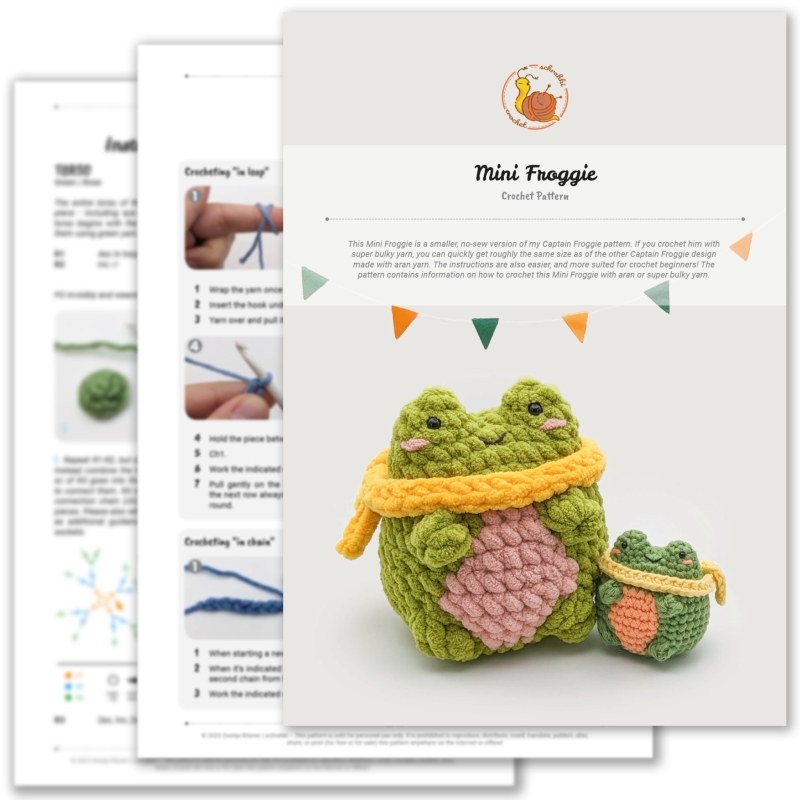 The pattern comes as one PDF file with detailed instructions on everything you need to know to crochet a Mini Froggie in aran or super bulky yarn. It can be followed step-by-step and is accompanied by photos for all the trickier parts.